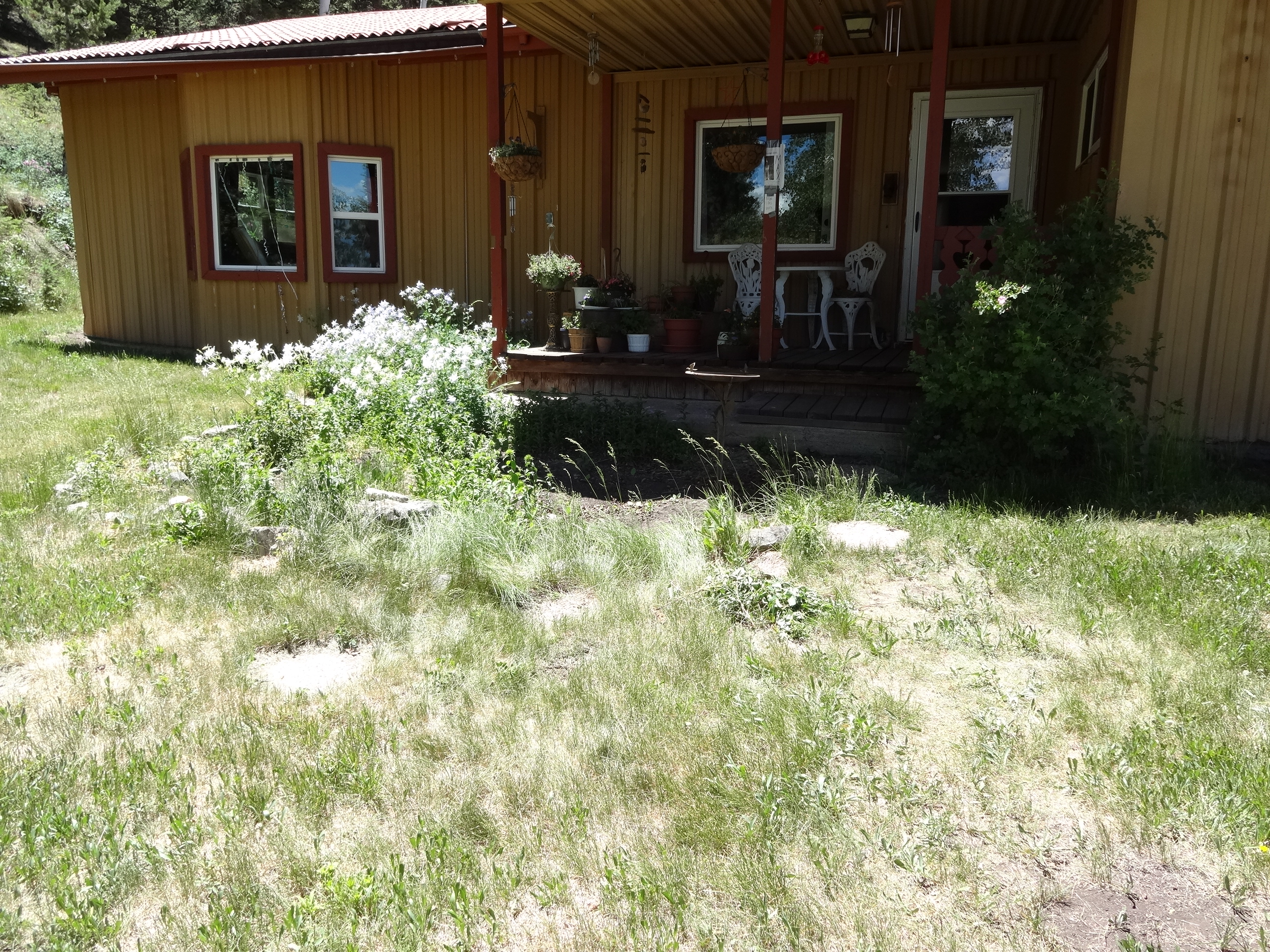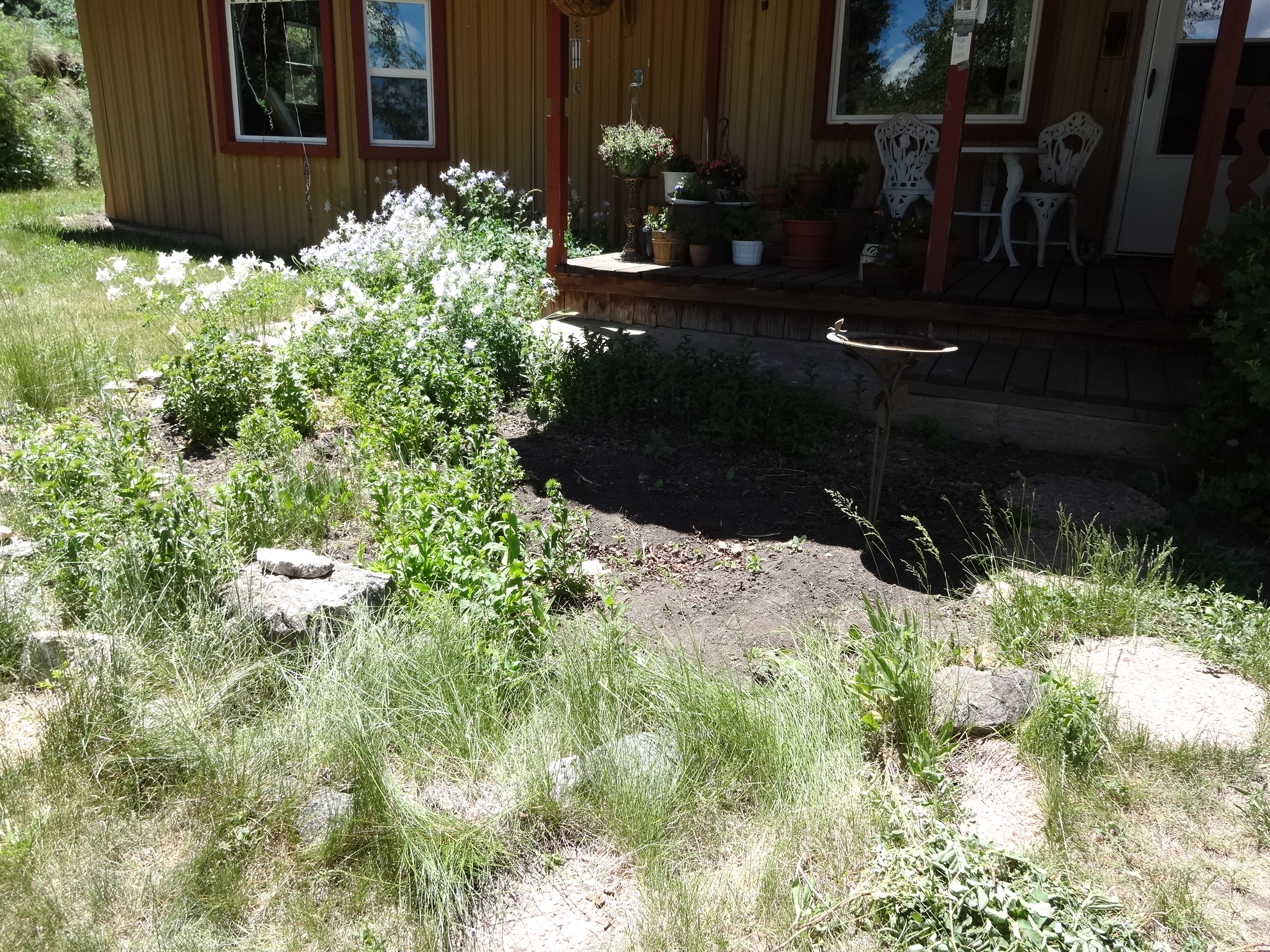 Then, we’ve decided to buy some flowers to fill in the spot in front DECIMATED by those cheeky bastards last year. (See photos below for before and after…you’ll have to be sitting down as the shock may cause a compensatory response altering the flow of blood to the brain…at least it does for me every time I see it.)