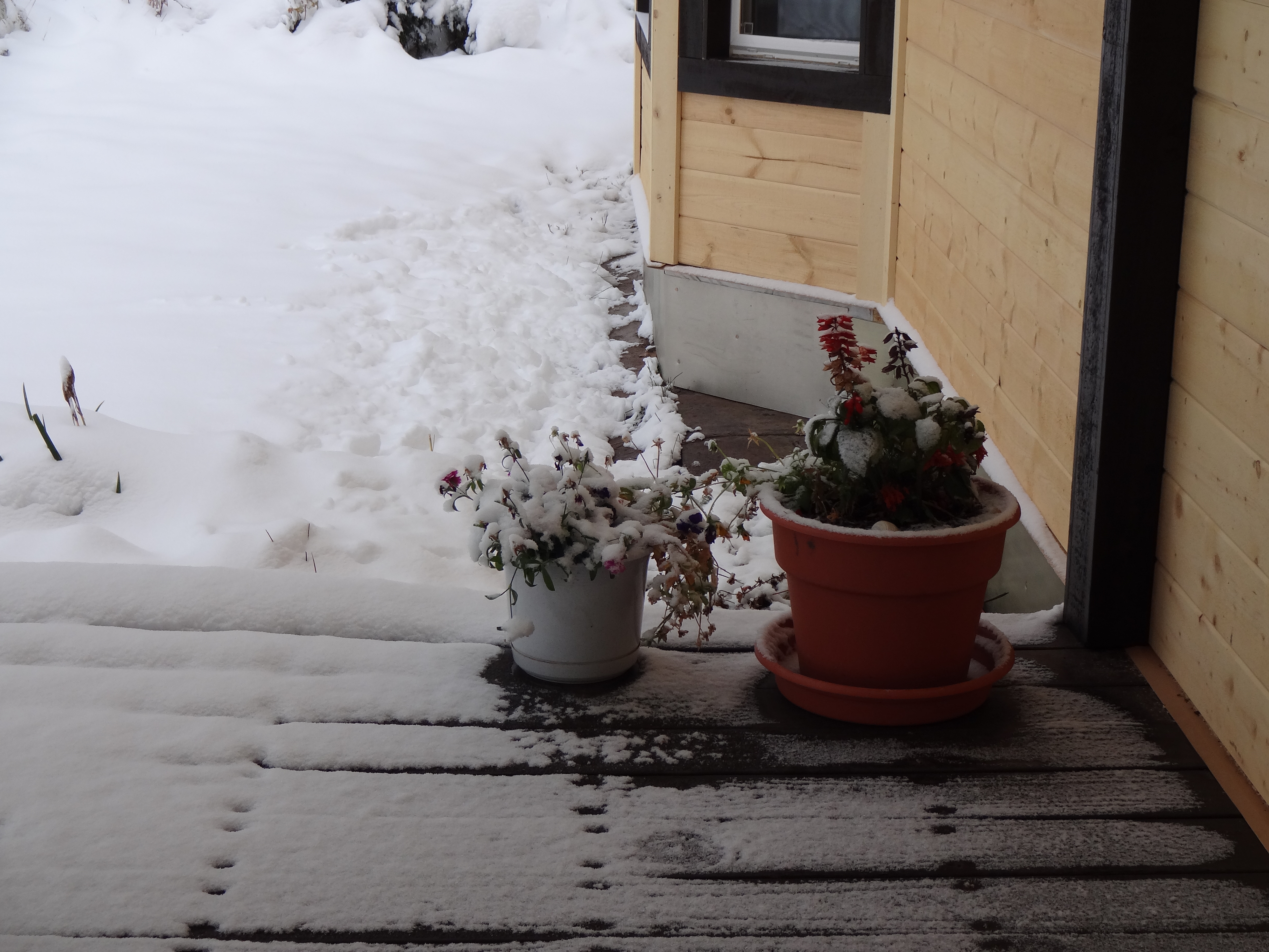 Needless to say, the flowers are buried. I forgot the ones on the front porch. And they were oh so pretty. But such is life. The stellar jays are going through the birdseed like it’s, well, free birdseed. (All of my Republican acquaintences might call them…here…wait for it–MOOCHERS. Hanging around for handouts. Sorry, just couldn’t stay away from political references. I’ll try to get a handle on that.)