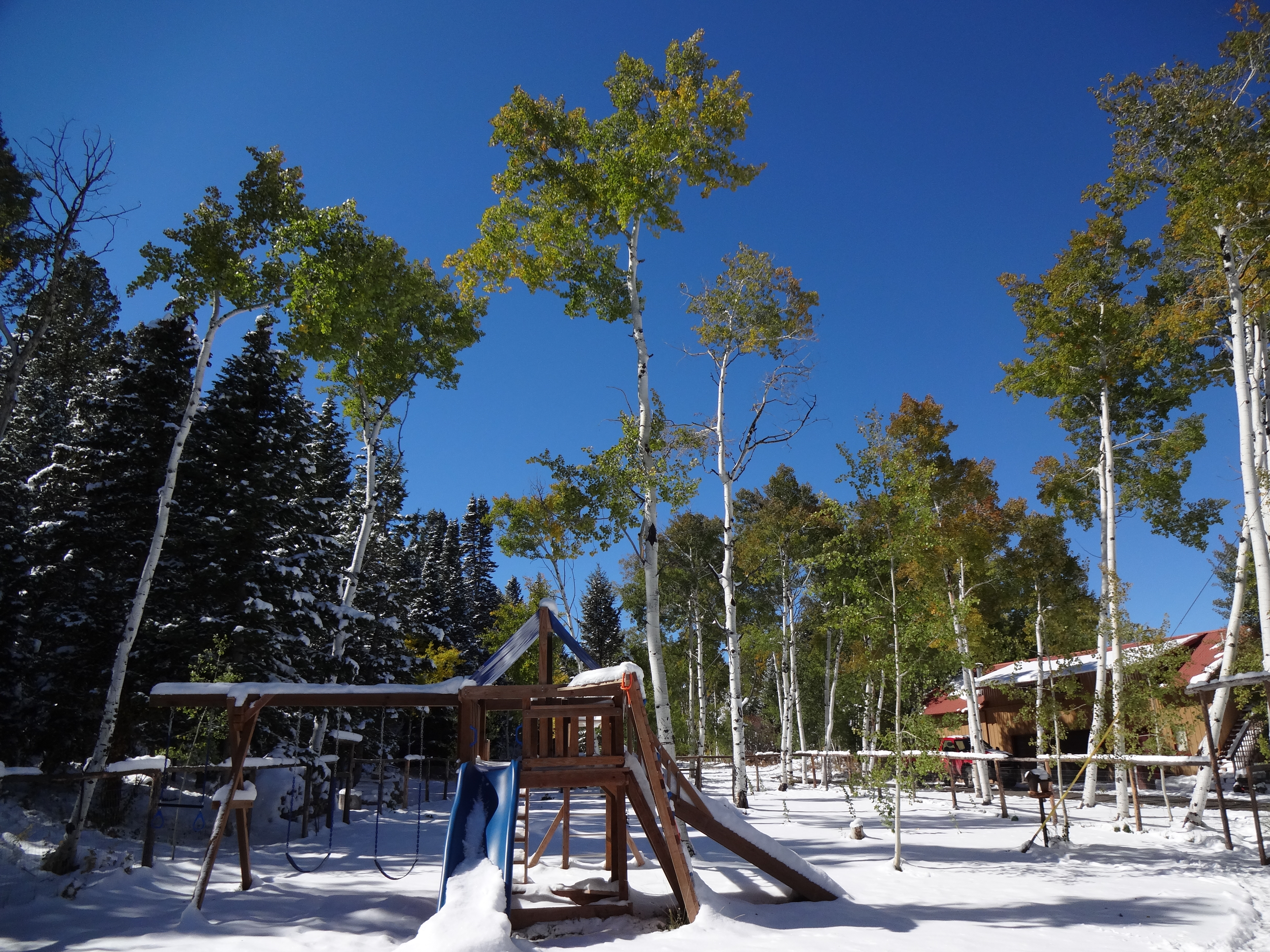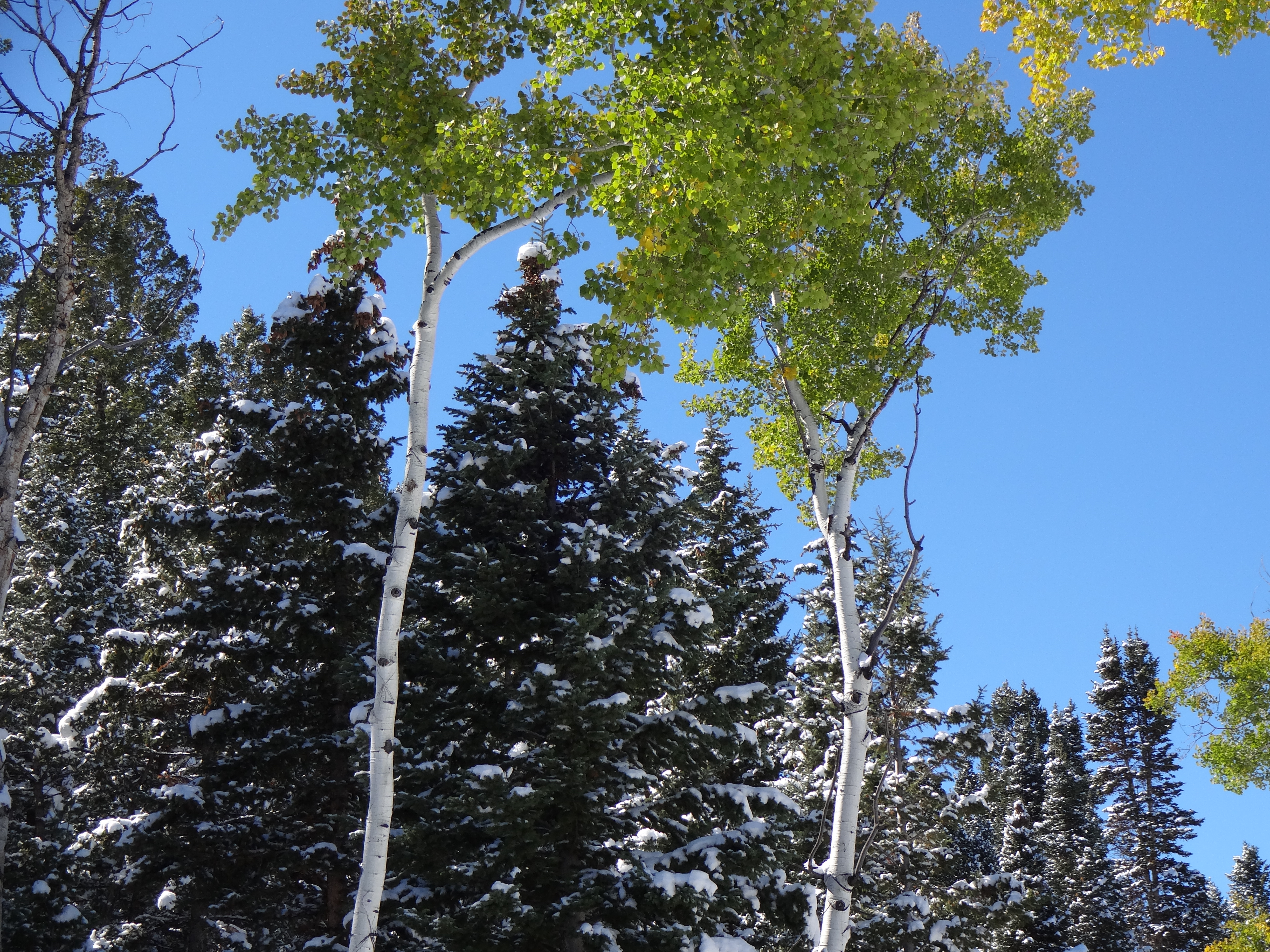 Today brought a beautiful, cerulean blue sky, not a cloud in sight with sunlight streaming through the variously yellow shaded leaves of the aspen trees.  The contrast of the gold, yellow, bright green, and orange leaves against the snow-covered branches of the deep green pine trees was really quite stunning.  The white and black bark of the aspen trees was accentuated and it all came together to paint quite a pretty picture.  See below.
