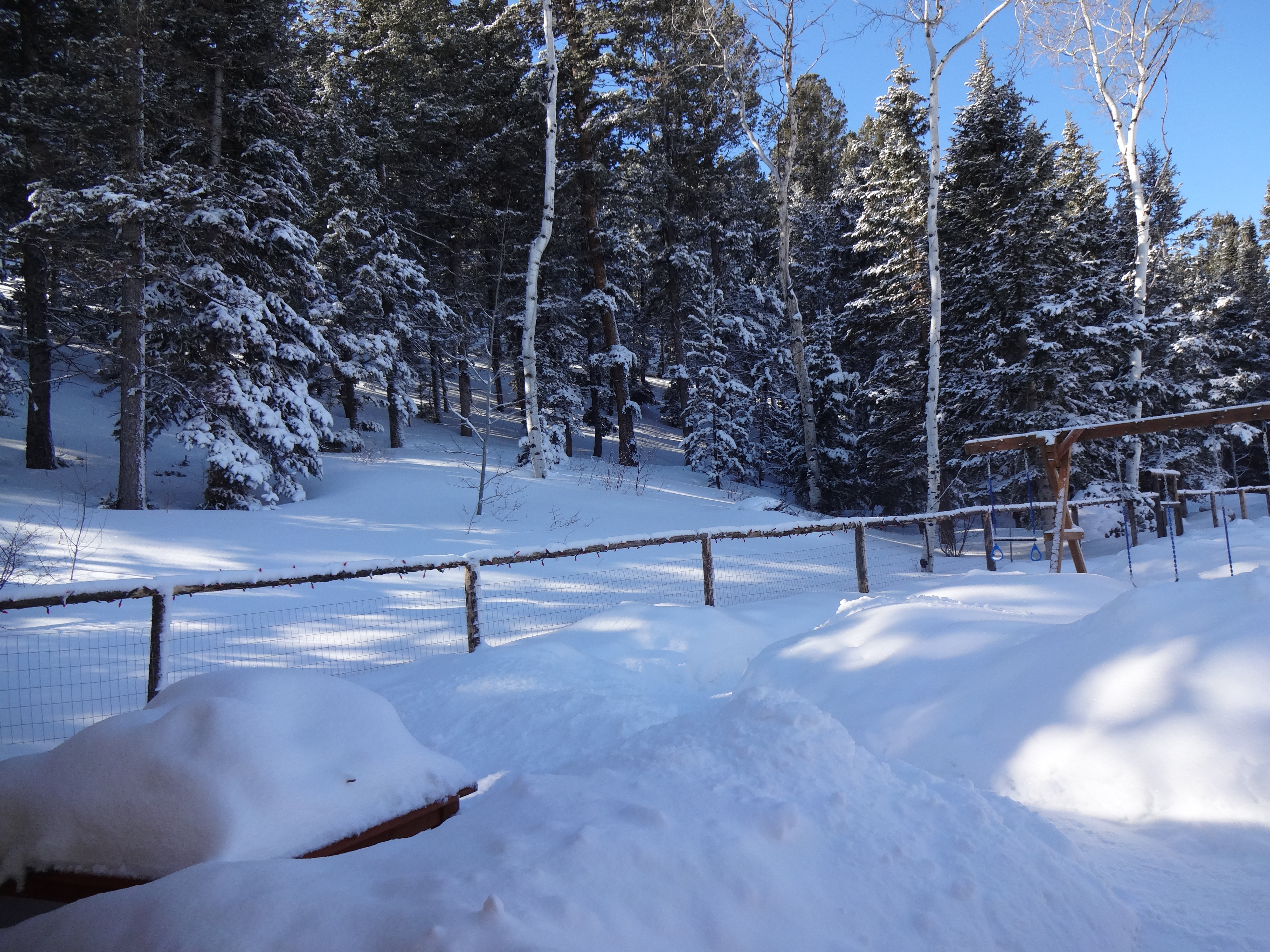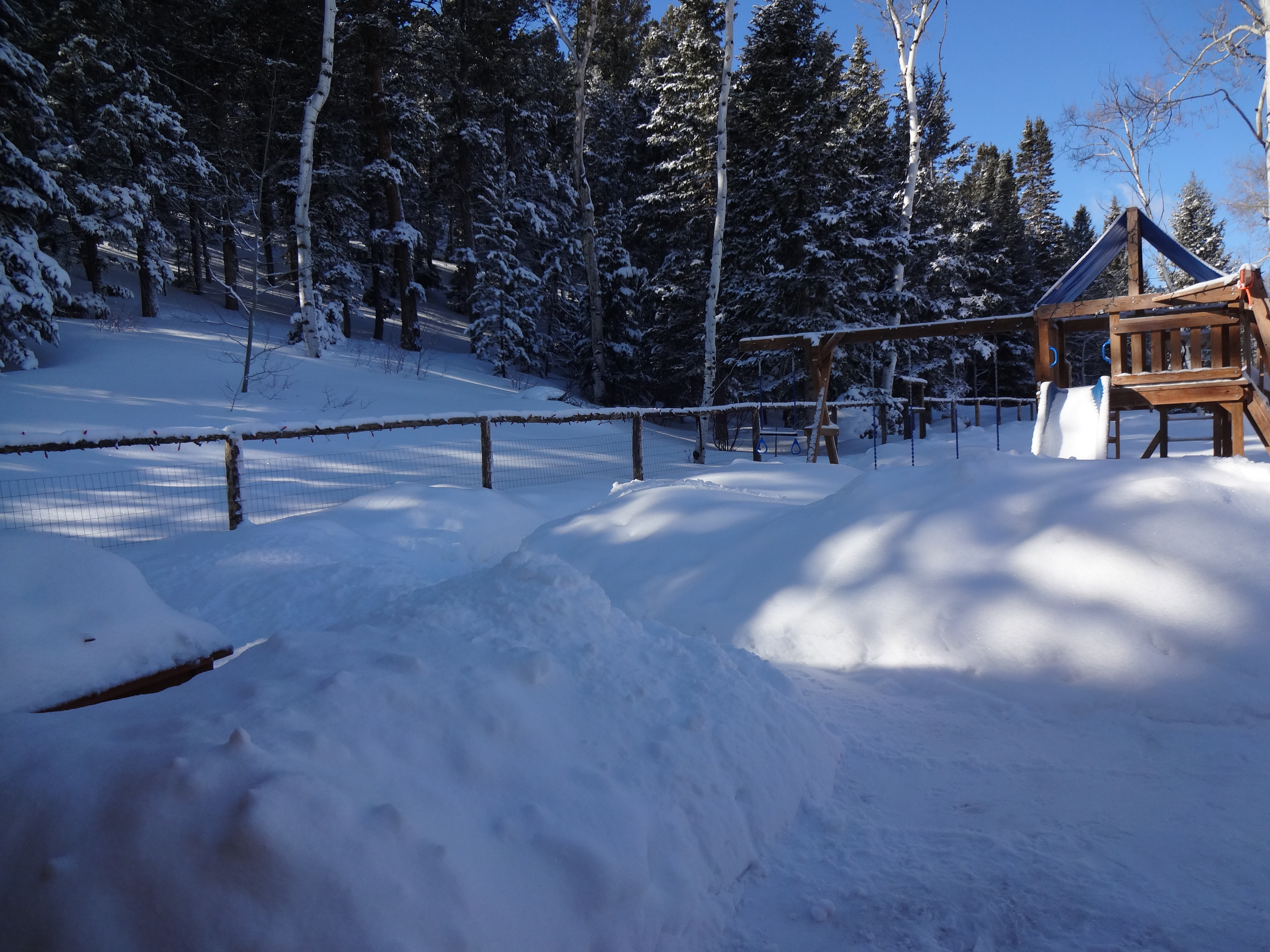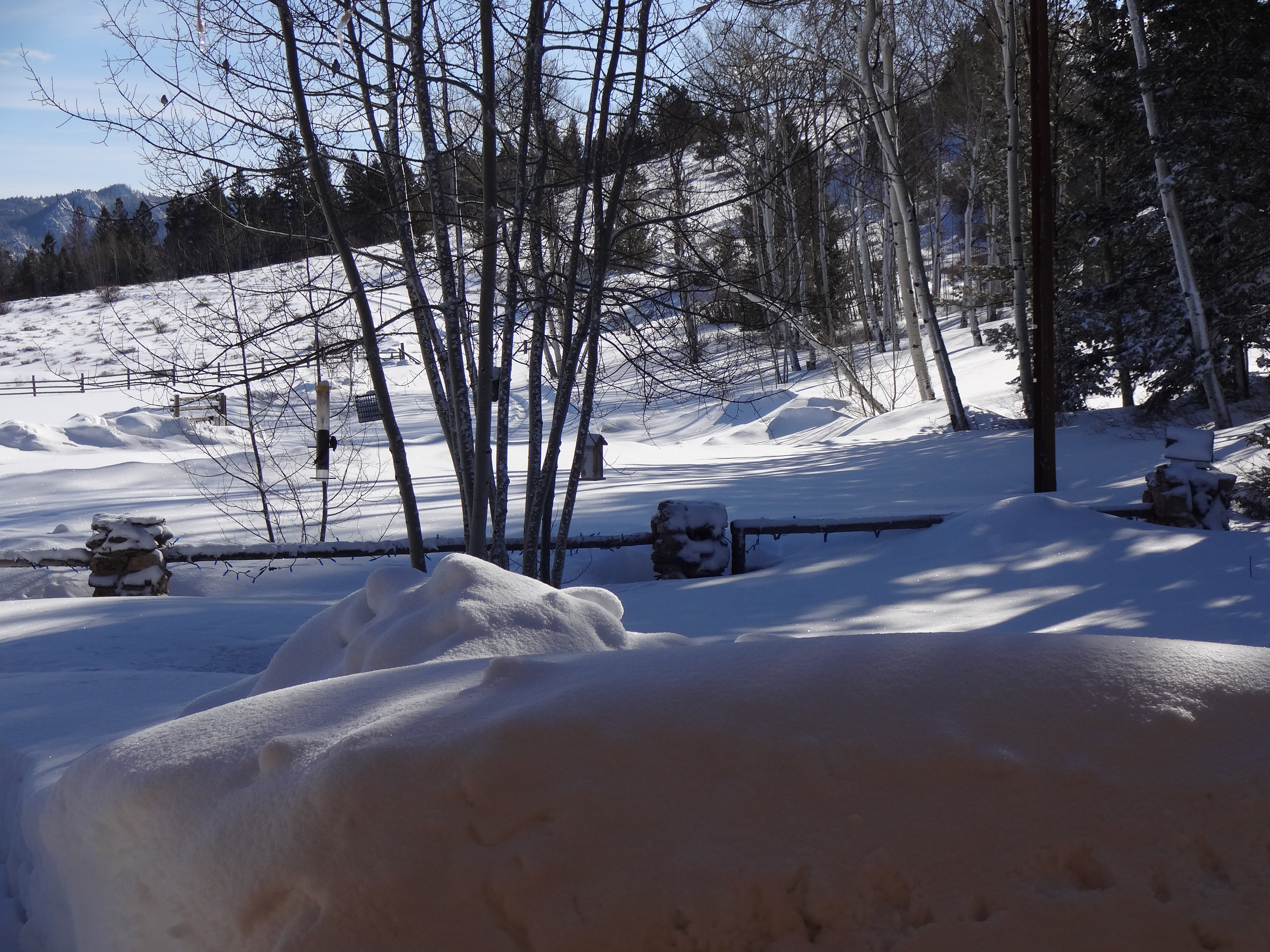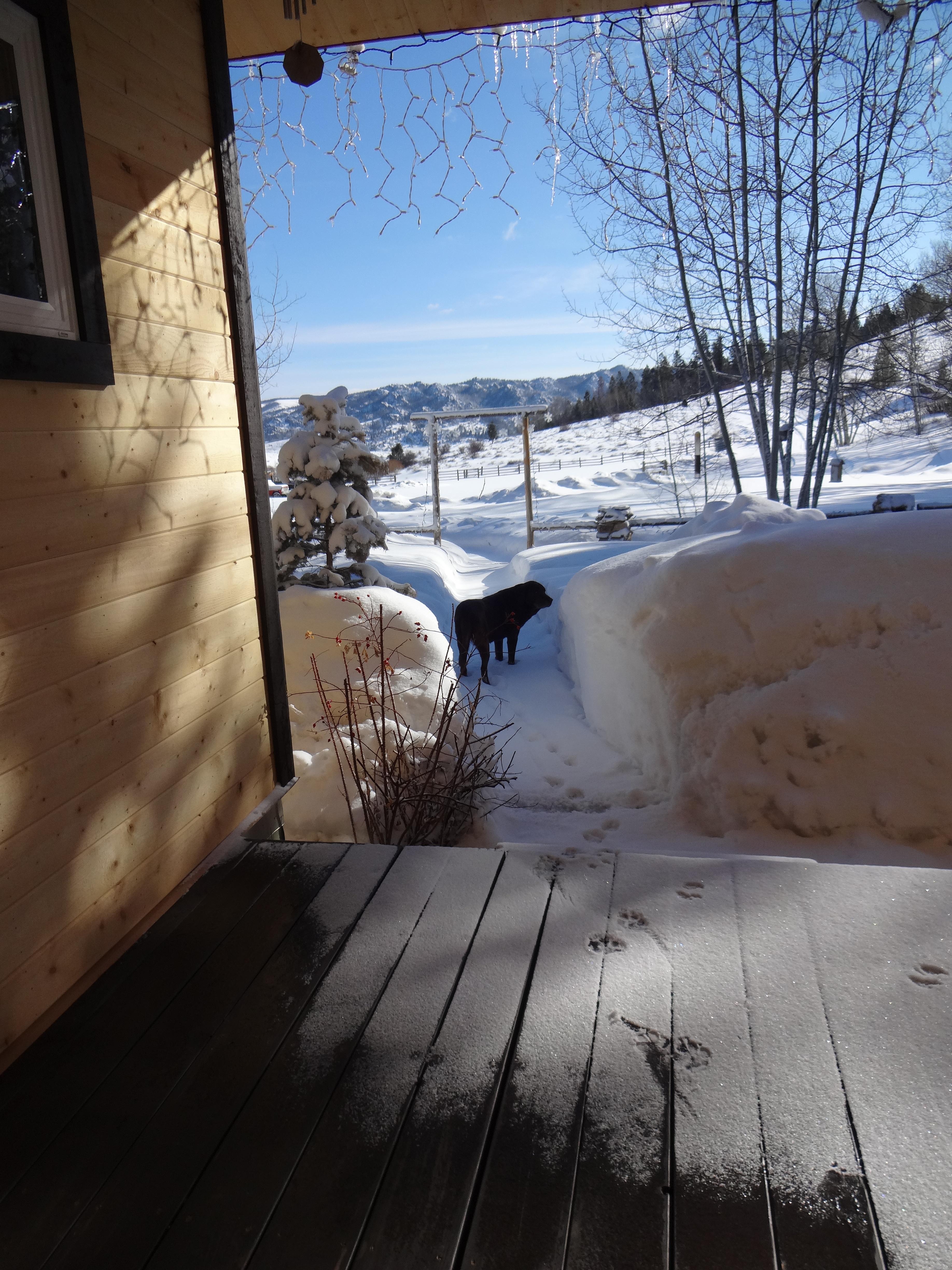 I neglected to capture images of the coyote tracks. Our resident coyote was at the fence there some time in the wee small hours of the morning. He (I’m assuming, shouldn’t do that I know) and Buck have a sort of contest going on to see who can make the most yellow snow. Results not in yet as to the winner. I only wish they wouldn’t have picked the front lawn to wage their battle.
