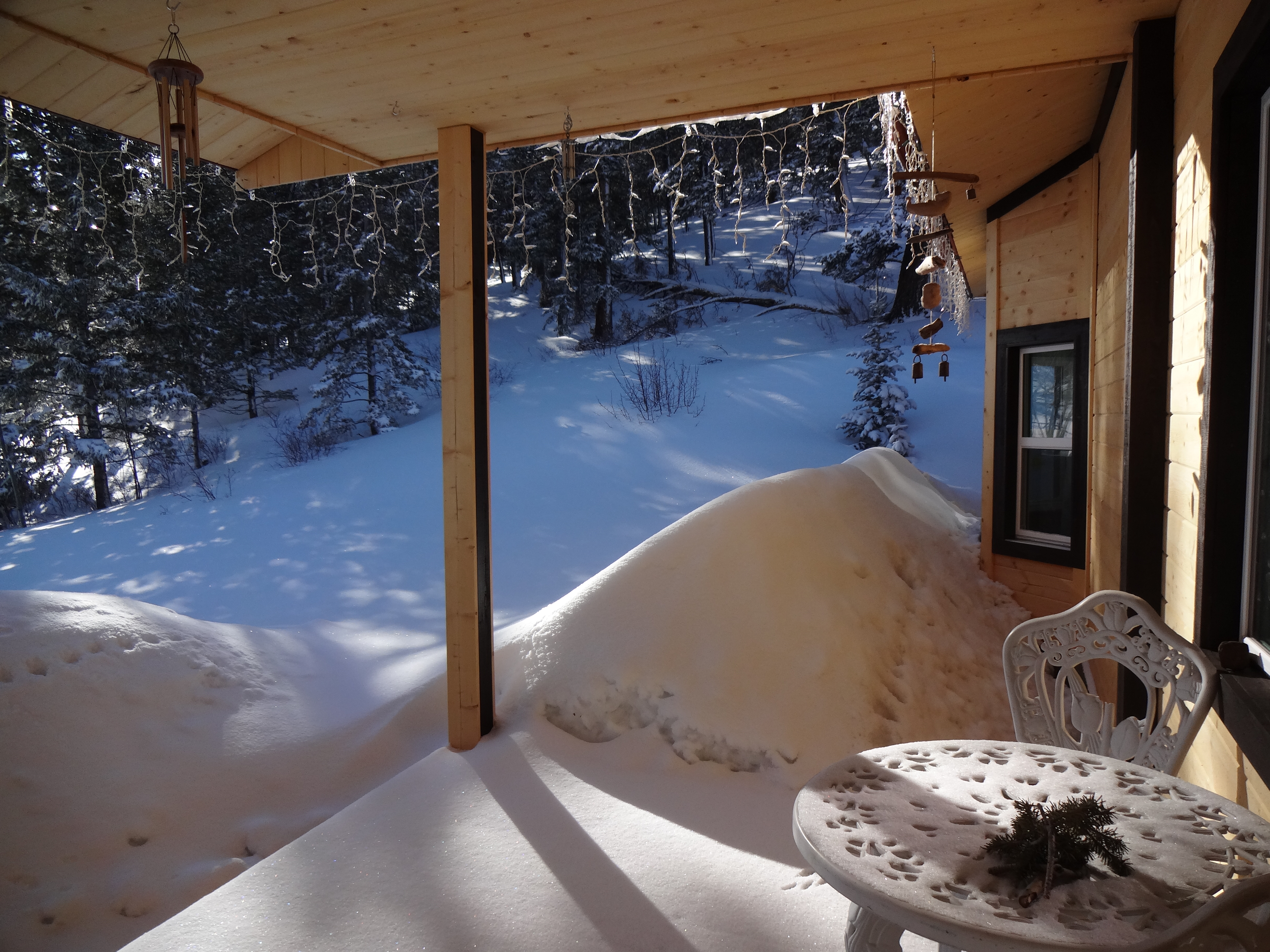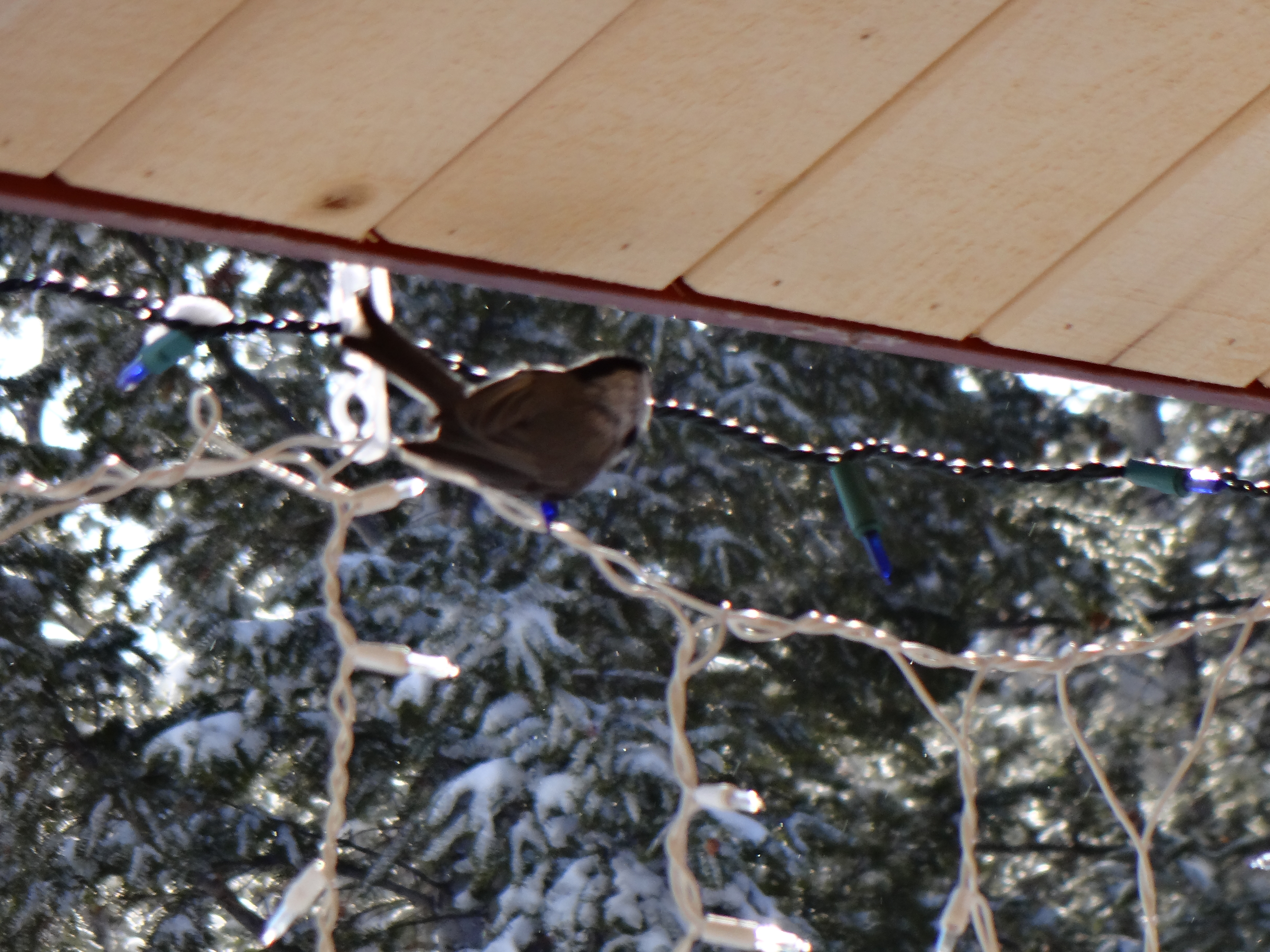 A mountain chickadee (maybe a black-capped…I’ve not quite decided yet) likes to sit on the icicle lights. Too cute and this morning I was prepared for him. Sort of. It’s not the best shot, but there you go. I don’t have any initials after my name touting photog credentials. So much to do, so little time. That career will have to wait I’m afraid.