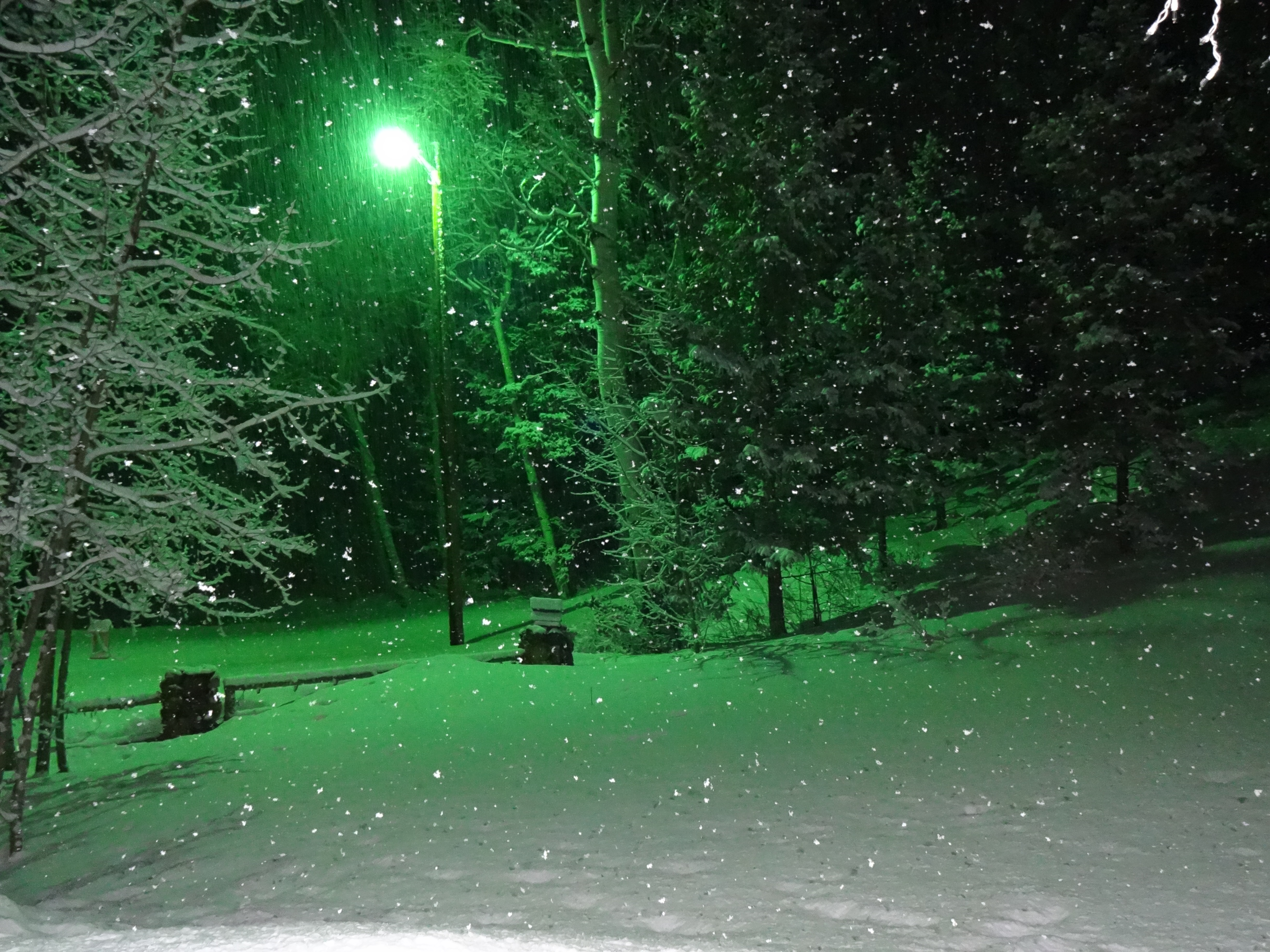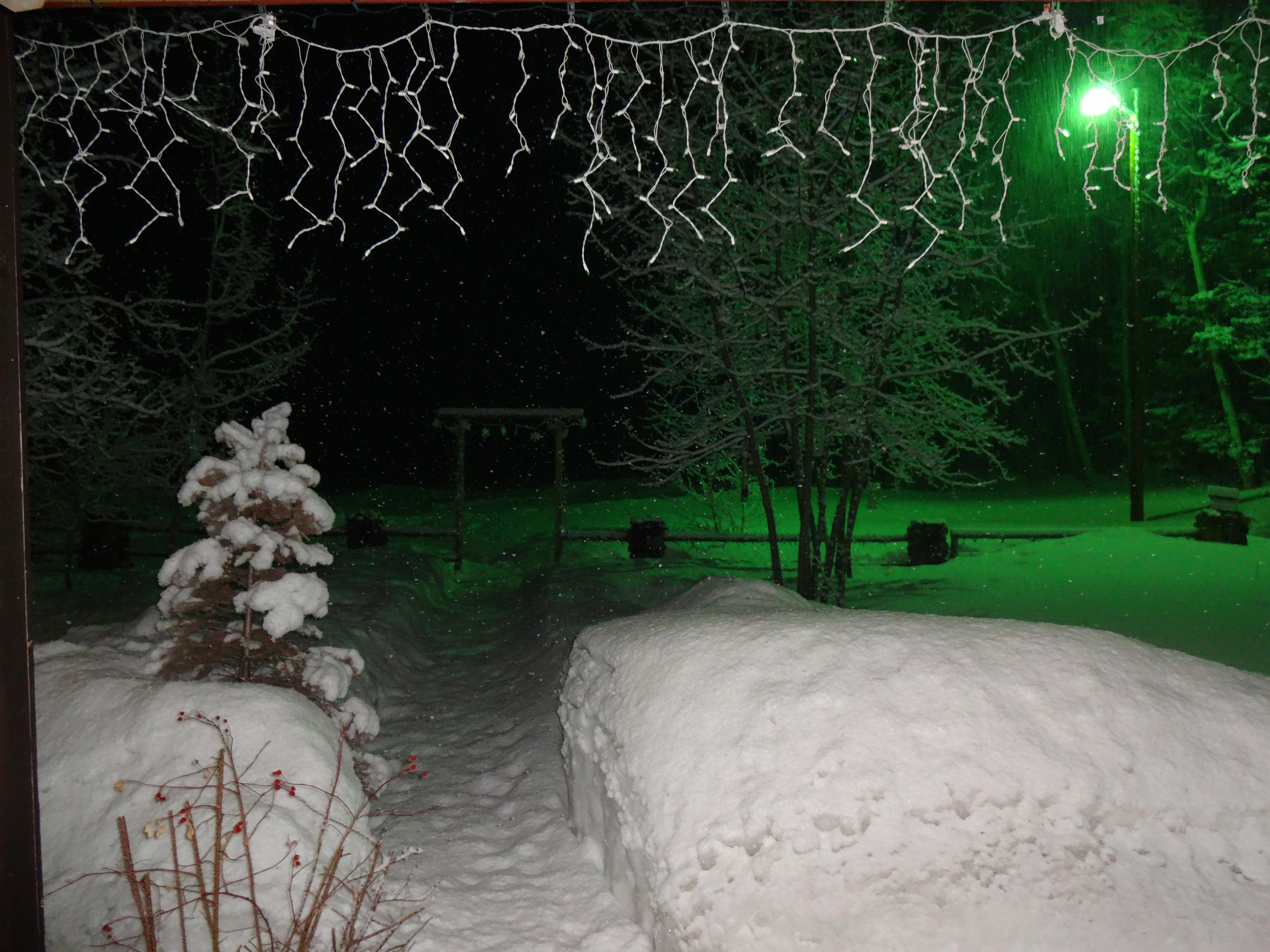It started snowing at dinnertime and by bedtime this was the view from the front porch. The combination of the flash and the “yard light” made for the greenness I think. I’m not entirely sure as photographer extraordinaire is not one of the hats I wear. I wear many, but not that one.