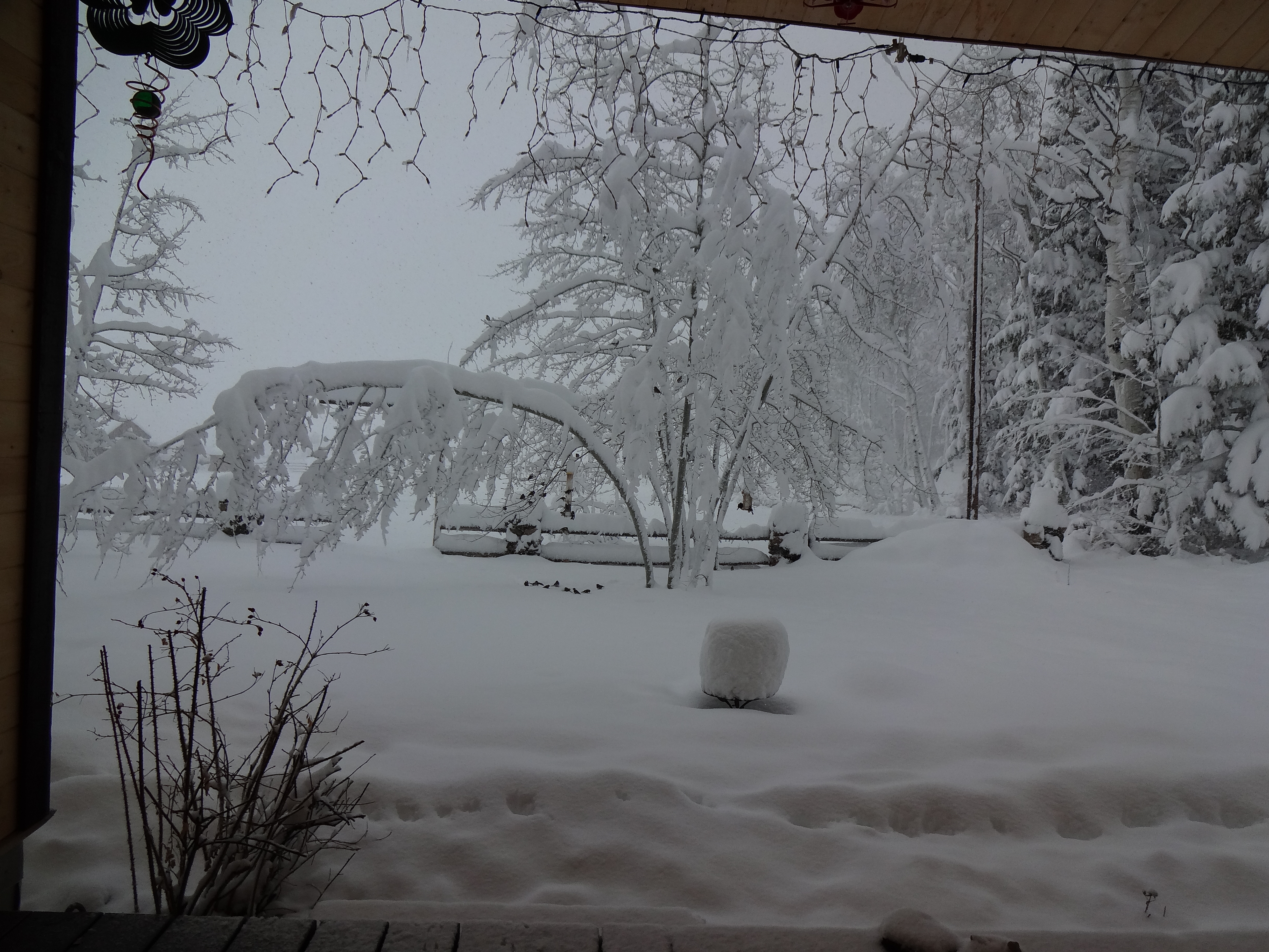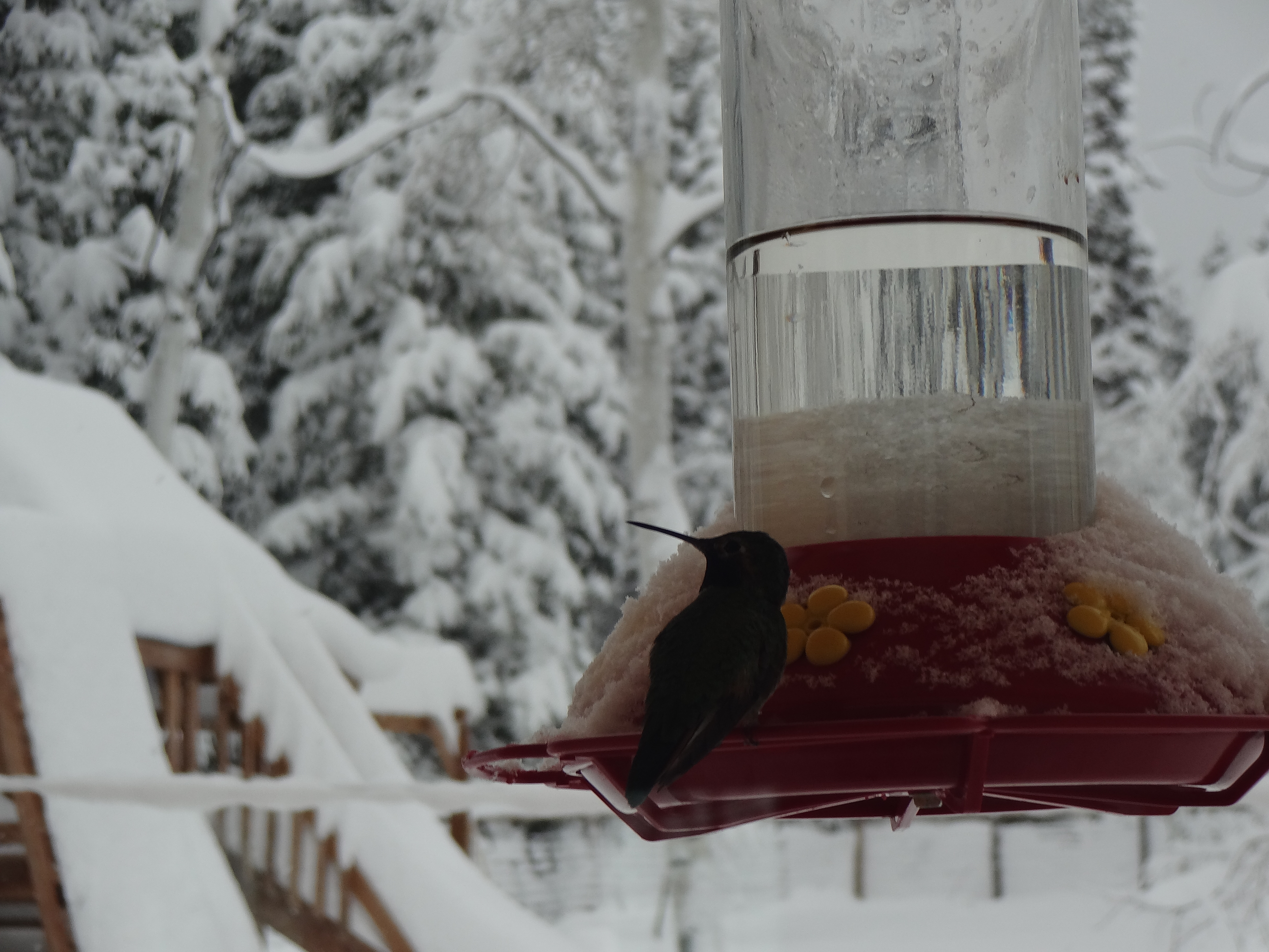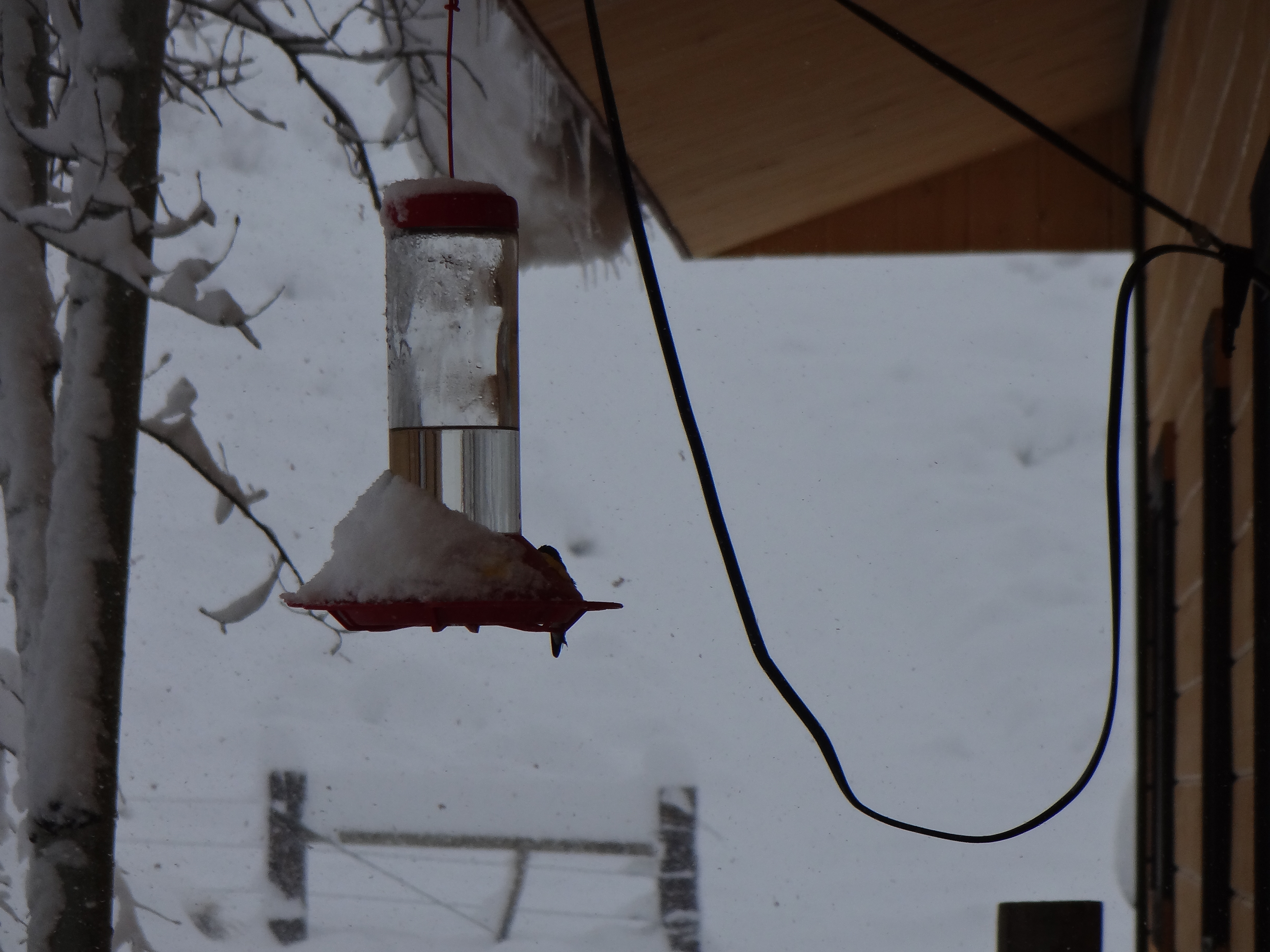 I dug out the snow pants and coat that I had erringly packed away already, and braved the two feet to feed our winged friends out front. I think they’re grateful, though that might be a mite bit anthropomorphic I suspect. Continuing on with that theme, I suspect the poor robins are a bit desperate. At least there is a patch of grass near the house that I’m seeing them scrabble around in. Not sure how many hummingbirds will survive this. They showed up about a week early this year. Usually they arrive this weekend. But this year they were zipping and diving on us as we left for dance class last Monday. I guess they shouldn’t have arrived early, eh? Man I bet they’re bummed. I just hope they make it. I’ve already had to unfreeze the feeders once this morning. I’ll go check them again shortly. I just don’t think they’re little bodies are meant for two feet of snow. I’m not seeing the numbers I saw earlier this week.