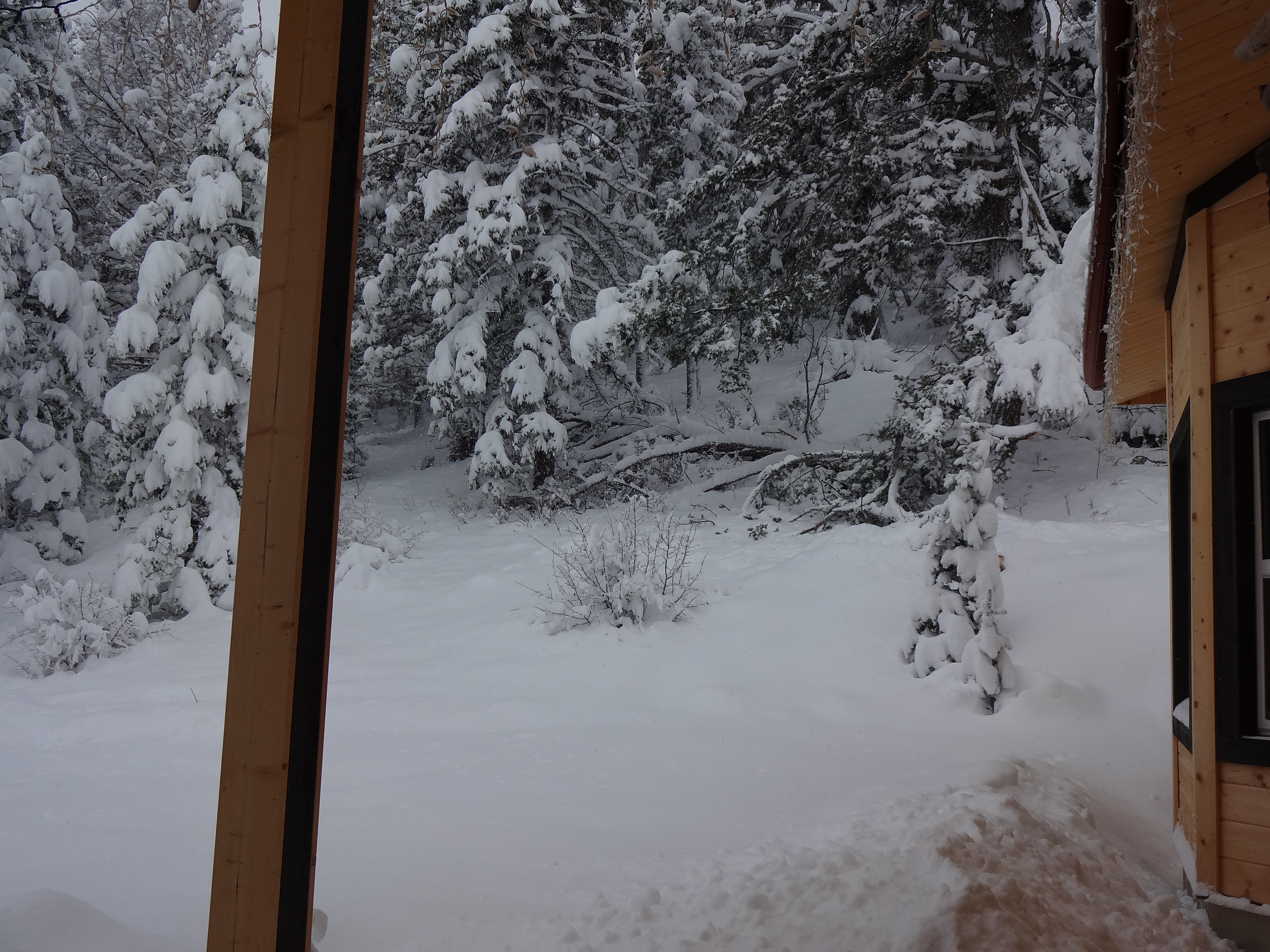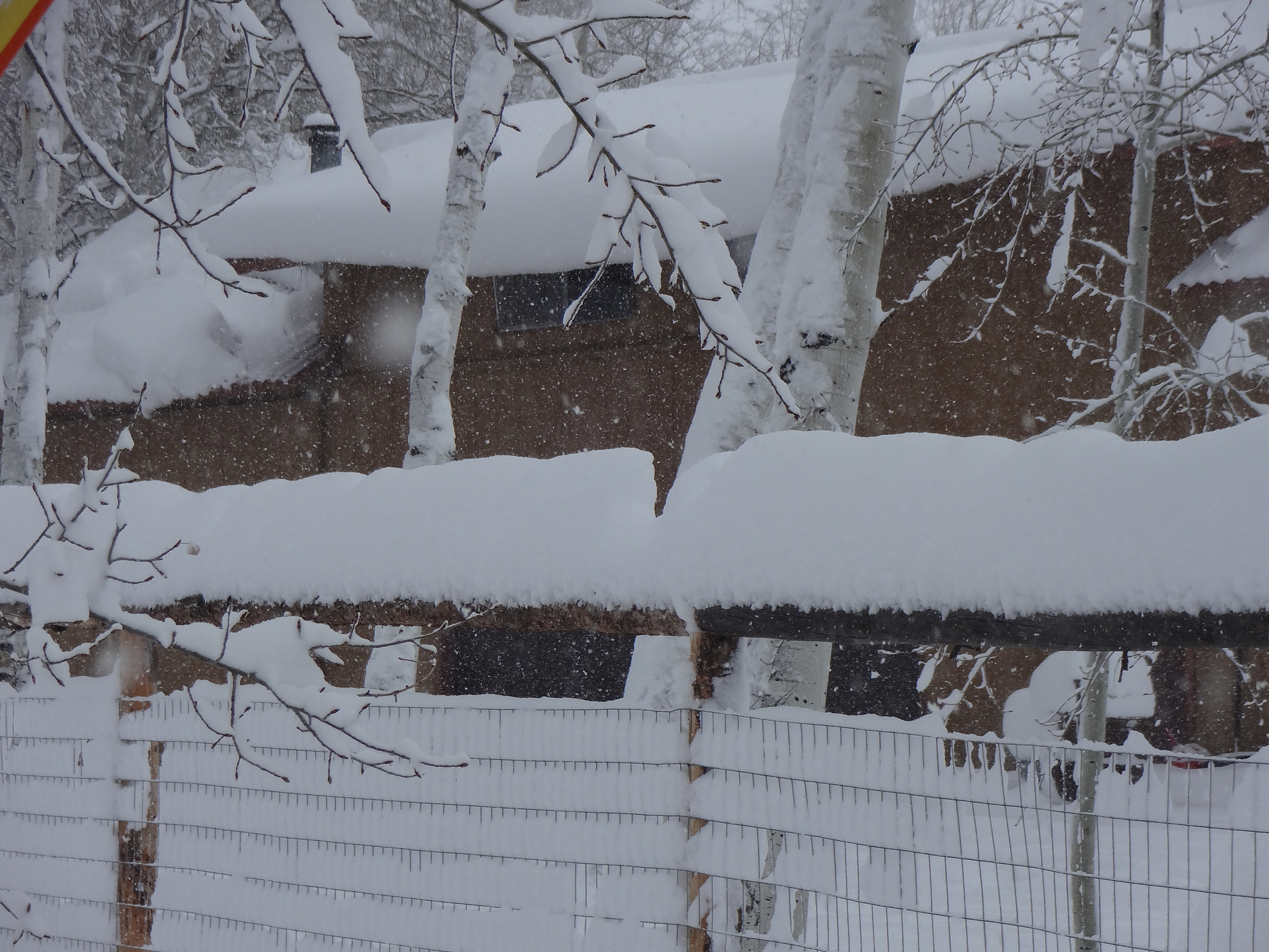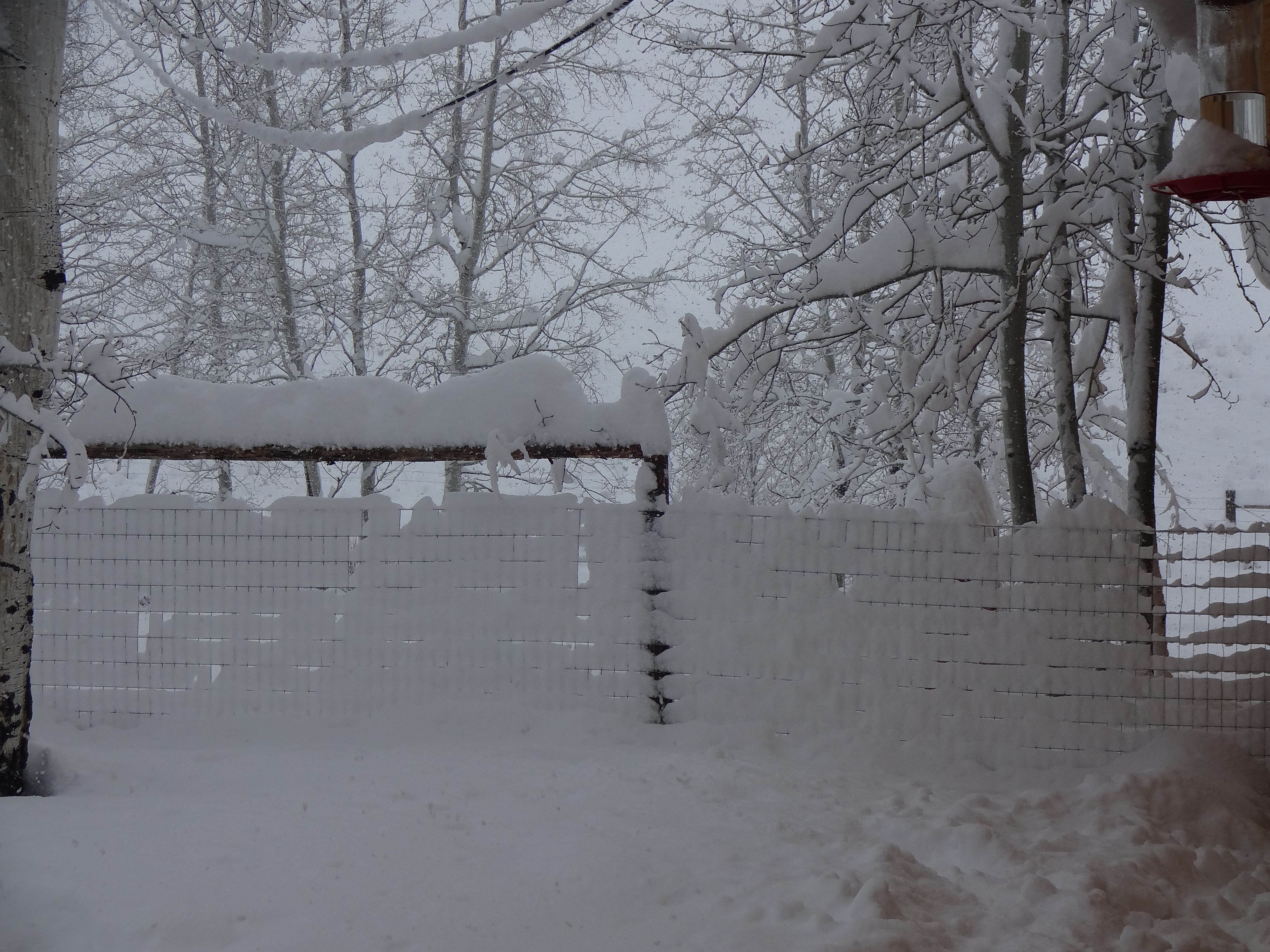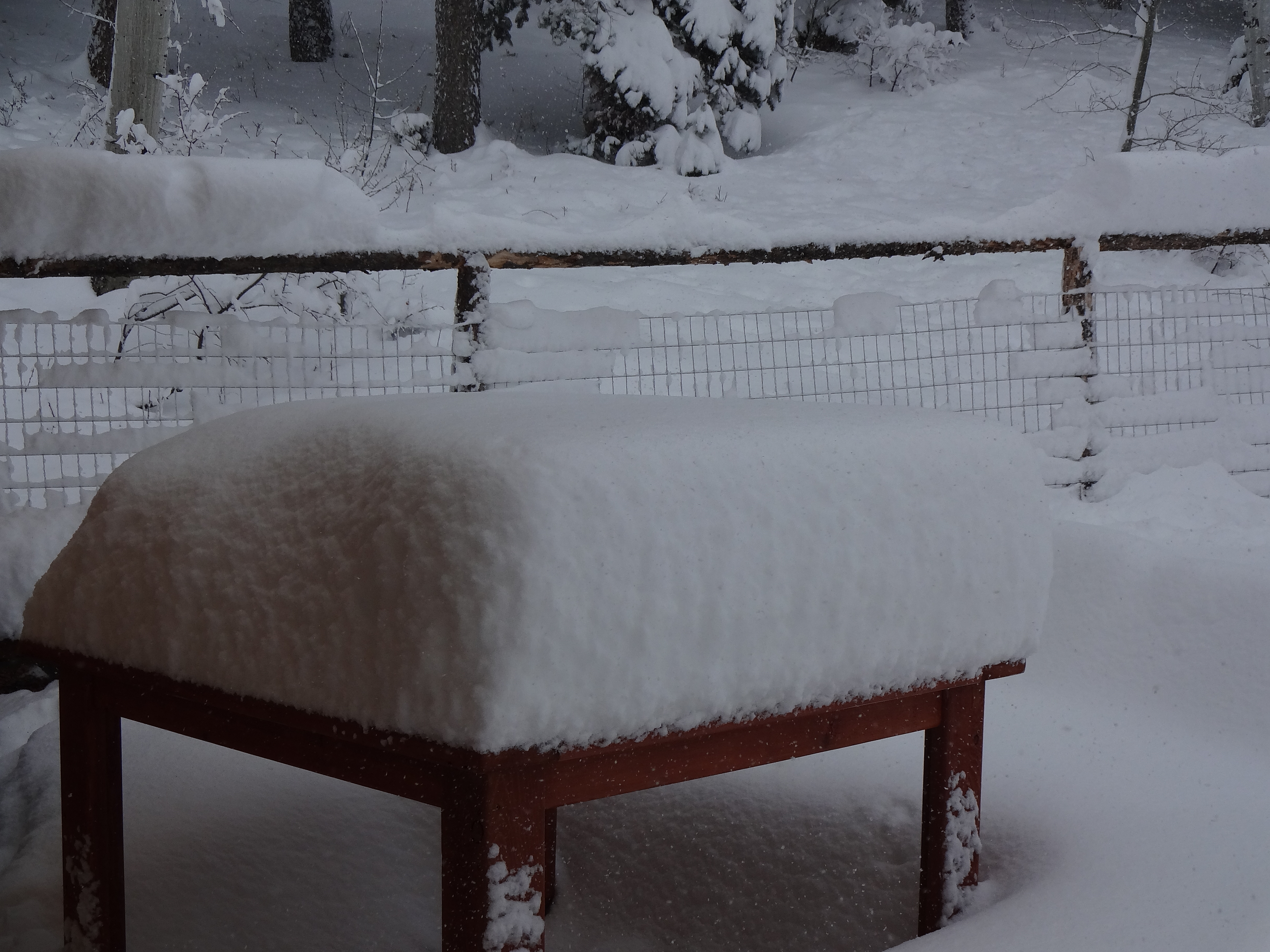 We’ve had several birds of various species (white crowned sparrow, gray-headed junco, mountain chickadee) hit the windows all morning. Going after bugs? Not sure what bugs are flying right now as it is STILL snowing. There must be at least two feet on the ground right now and more falling as I write. See the birdbath in the front yard!