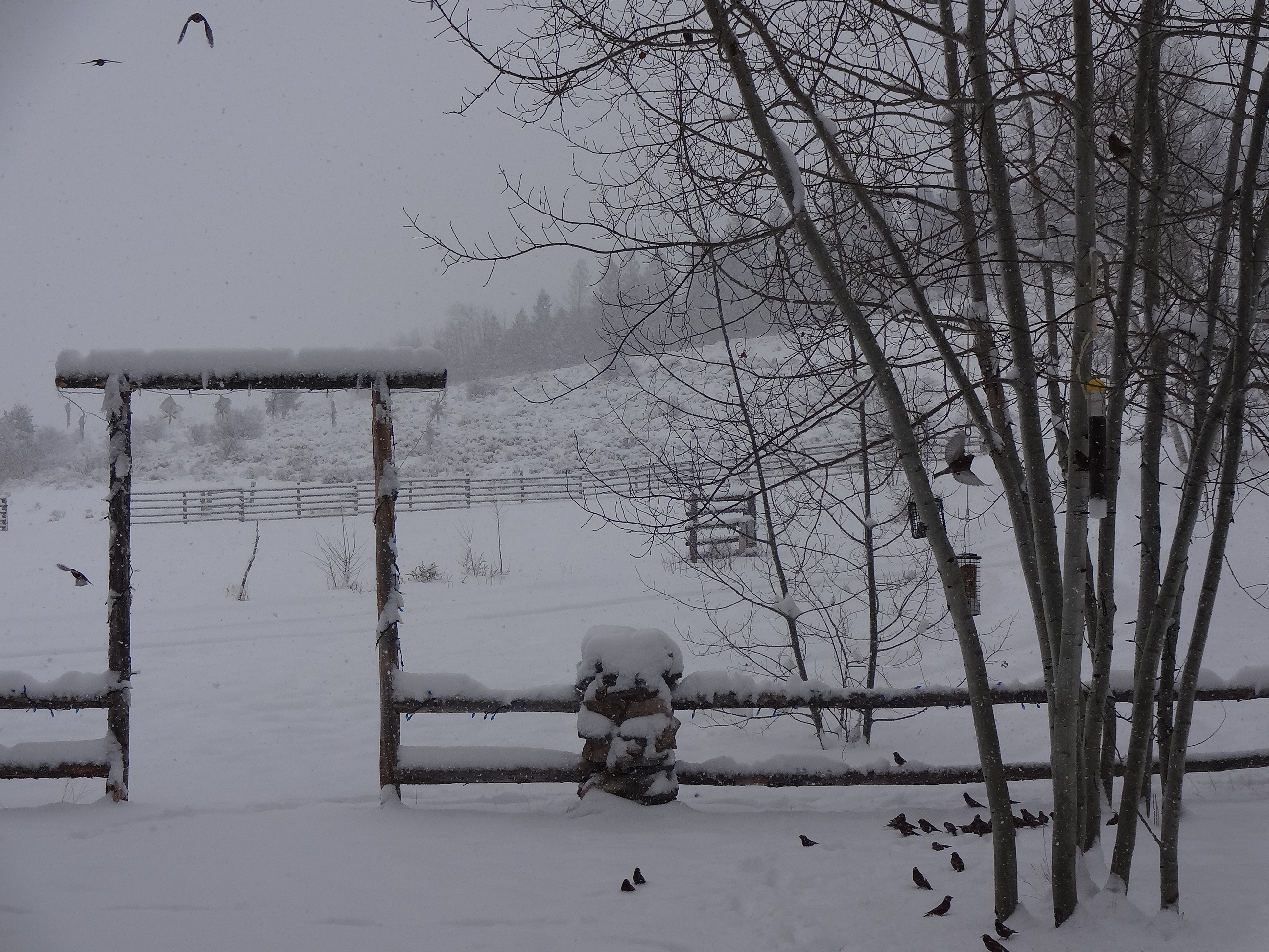 My estimation of inches fallen thus far always seems to overstate the amount (exaggeration much?), so keeping that in mind, I’m going to say about 4 or 5 inches of the fluffiest, prettiest snow we’ve seen in a LONG time is now on the ground and the trees and the fence and the driveway. Gorgeous, simply gorgeous. And so desperately needed. We had 50 degrees here this last week! And tried to go cross country skiing on Rabbit Ears. There was snow up there but boy howdy was it crunchy. Not that fun.