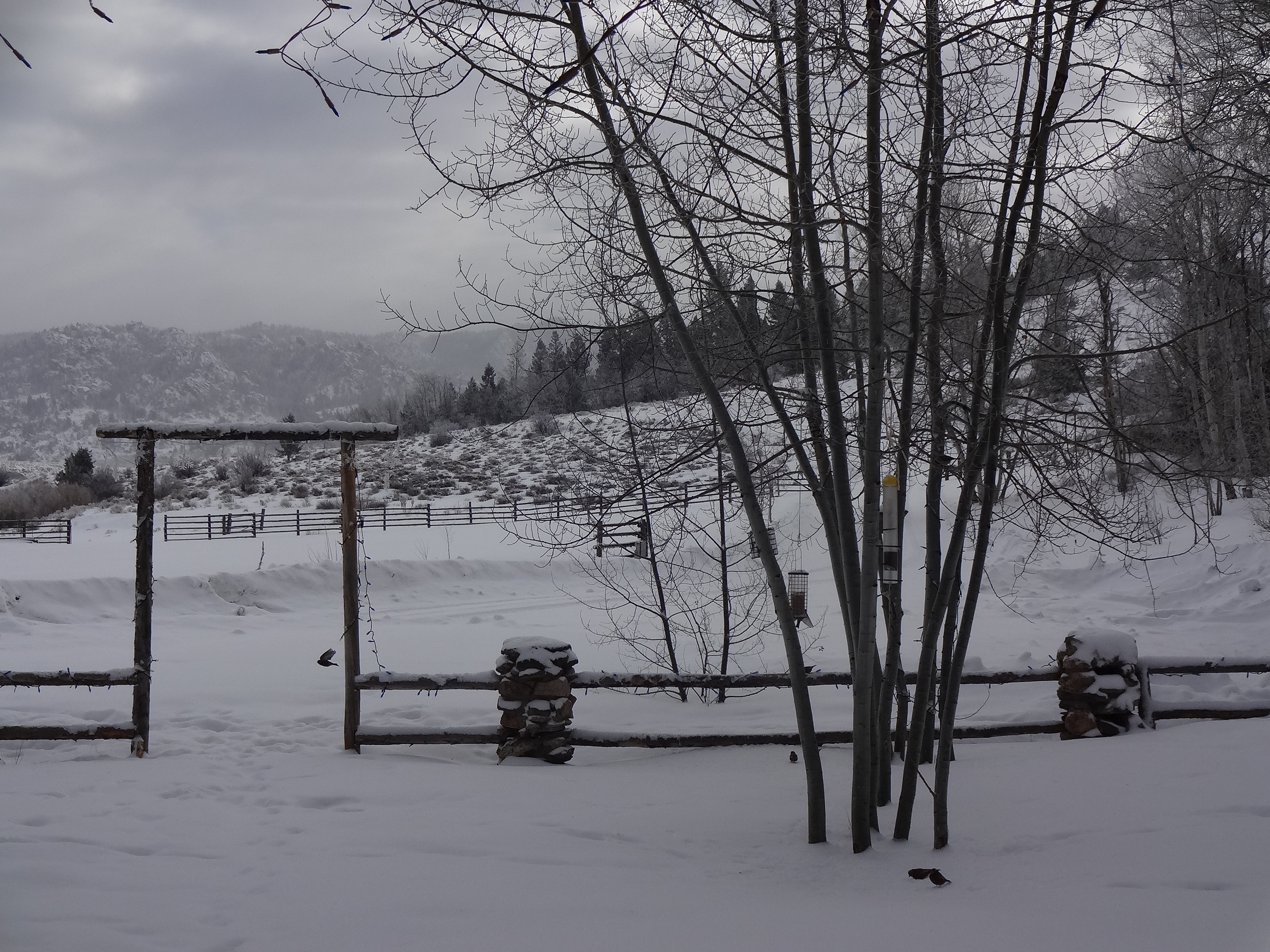 The extension cords are covered up out front, the icicles are hanging off of the garage roof, the sage brush is sort of turning white, I can’t see the dirt on the road. Life is good here.