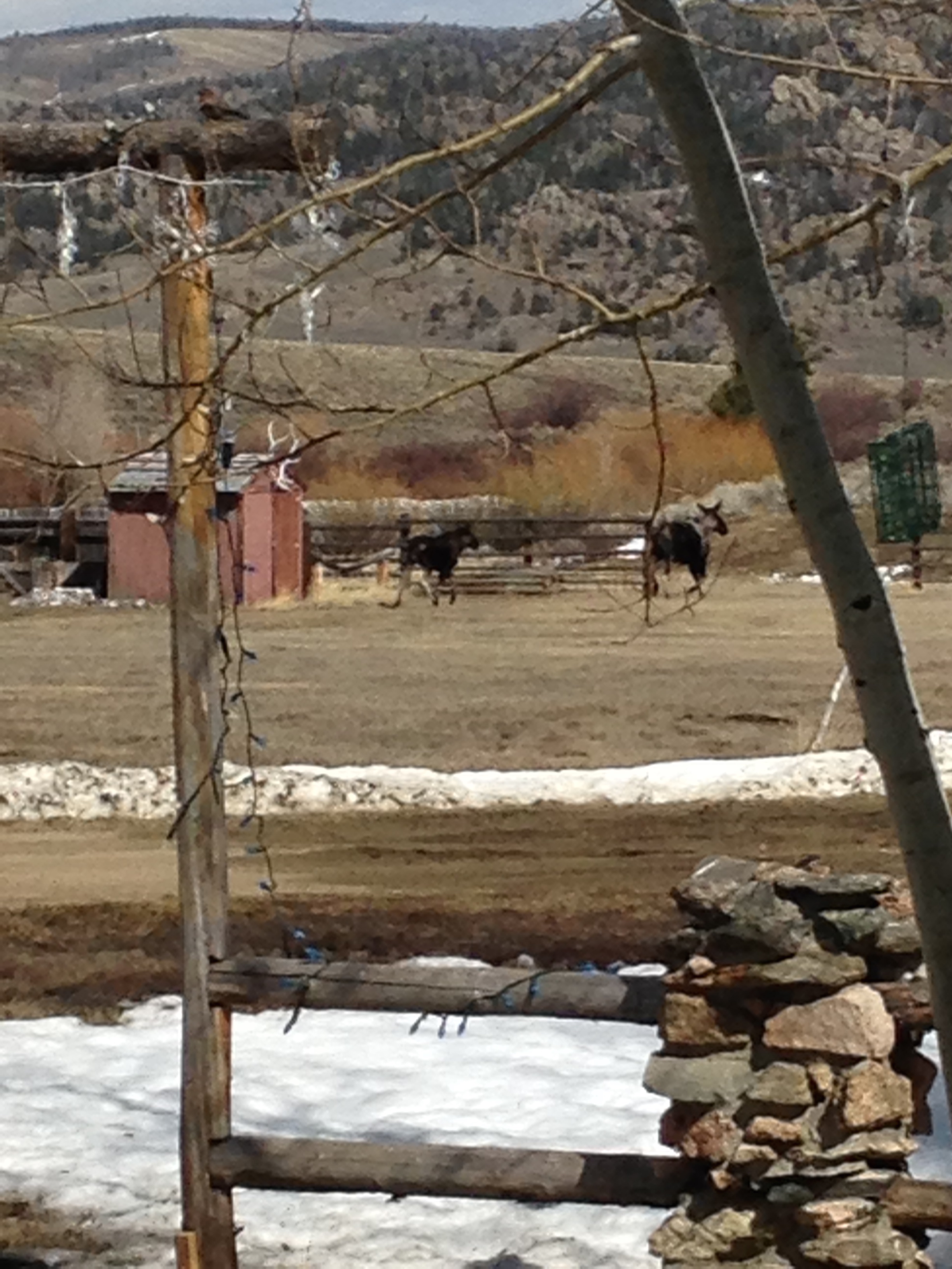 Finally, we were visited the other day by one we are assuming to be Matilda, with her calf in tow. I took umpteen pictures and a seven minute video, but I will not subject you to them all. One, they were taken from inside the house as I didn’t want to scare them away by going onto the porch and two, they were taken with the iPhone, which just doesn’t measure up to the digital camera. They were being, well, stalked is the only word I can come up with, by a third moose that I am assuming was not around for a friendly chat. Men. What can you say?