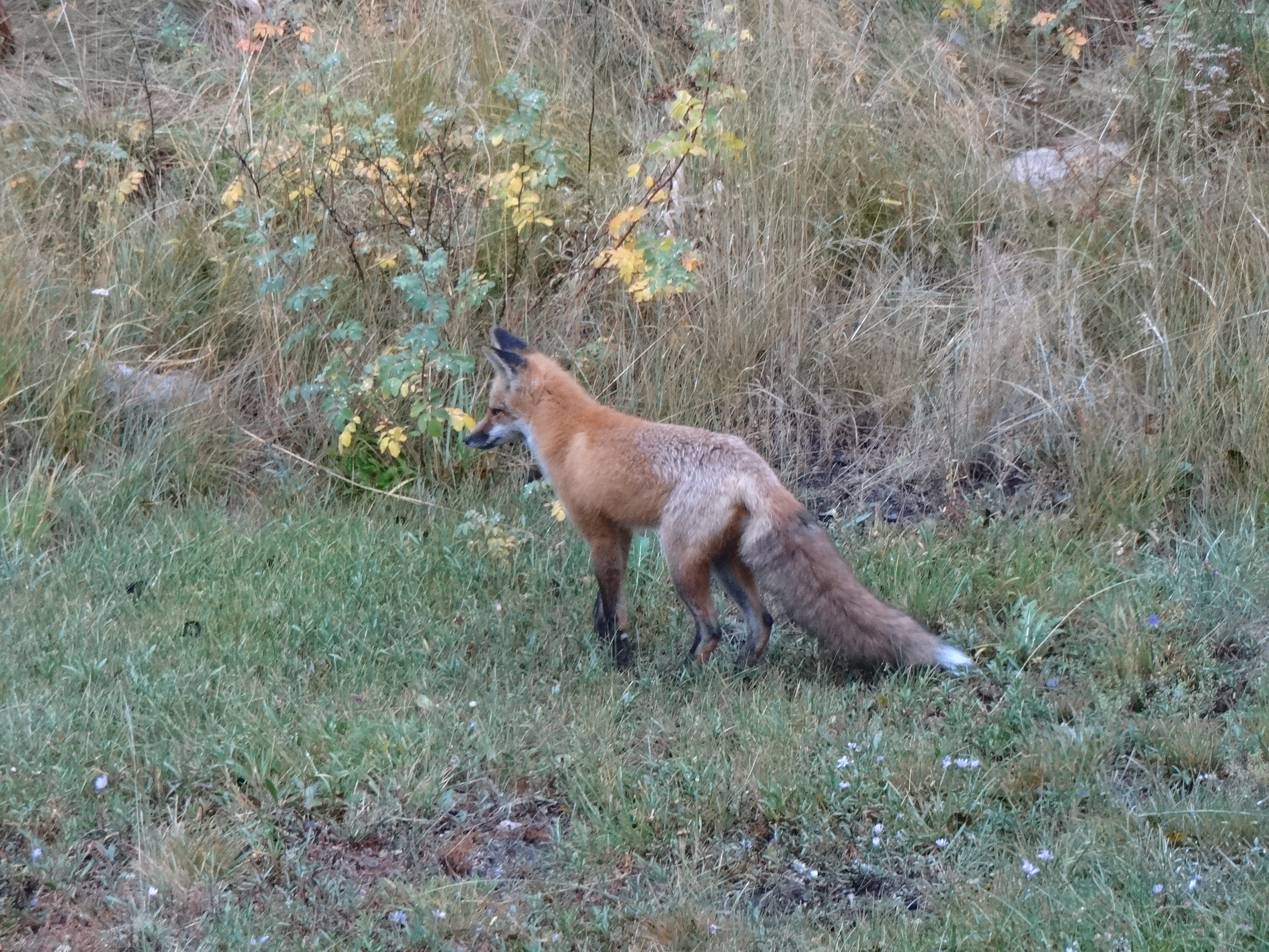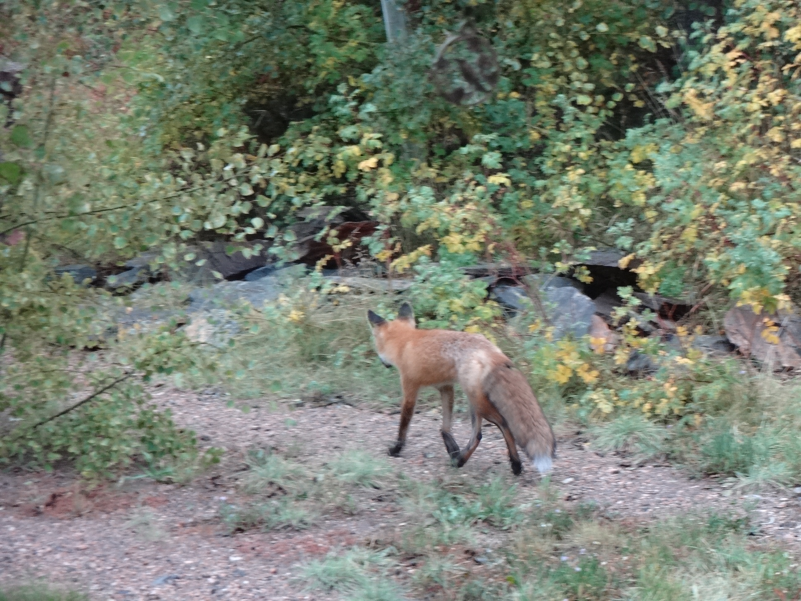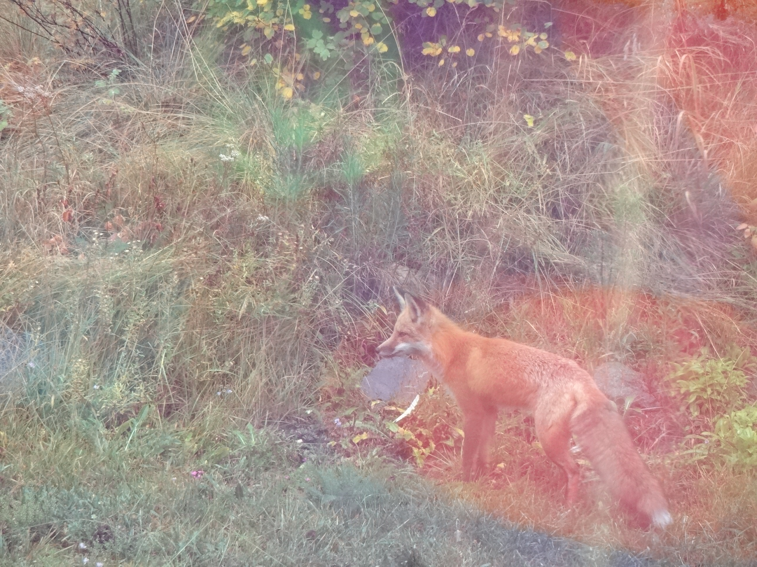 Anyway, he’s been tooling around here for a couple of weeks. Leaving his scat in strategic spots around the property, I’m thinking in a fashion to drive the canines berserk. Which it does. And which makes the husband and I laugh at the fox’s ingenuity. As in a single piece of scat on the doorstep in front of the shop. And another at the beginning of the path to the house. Makes us smile.