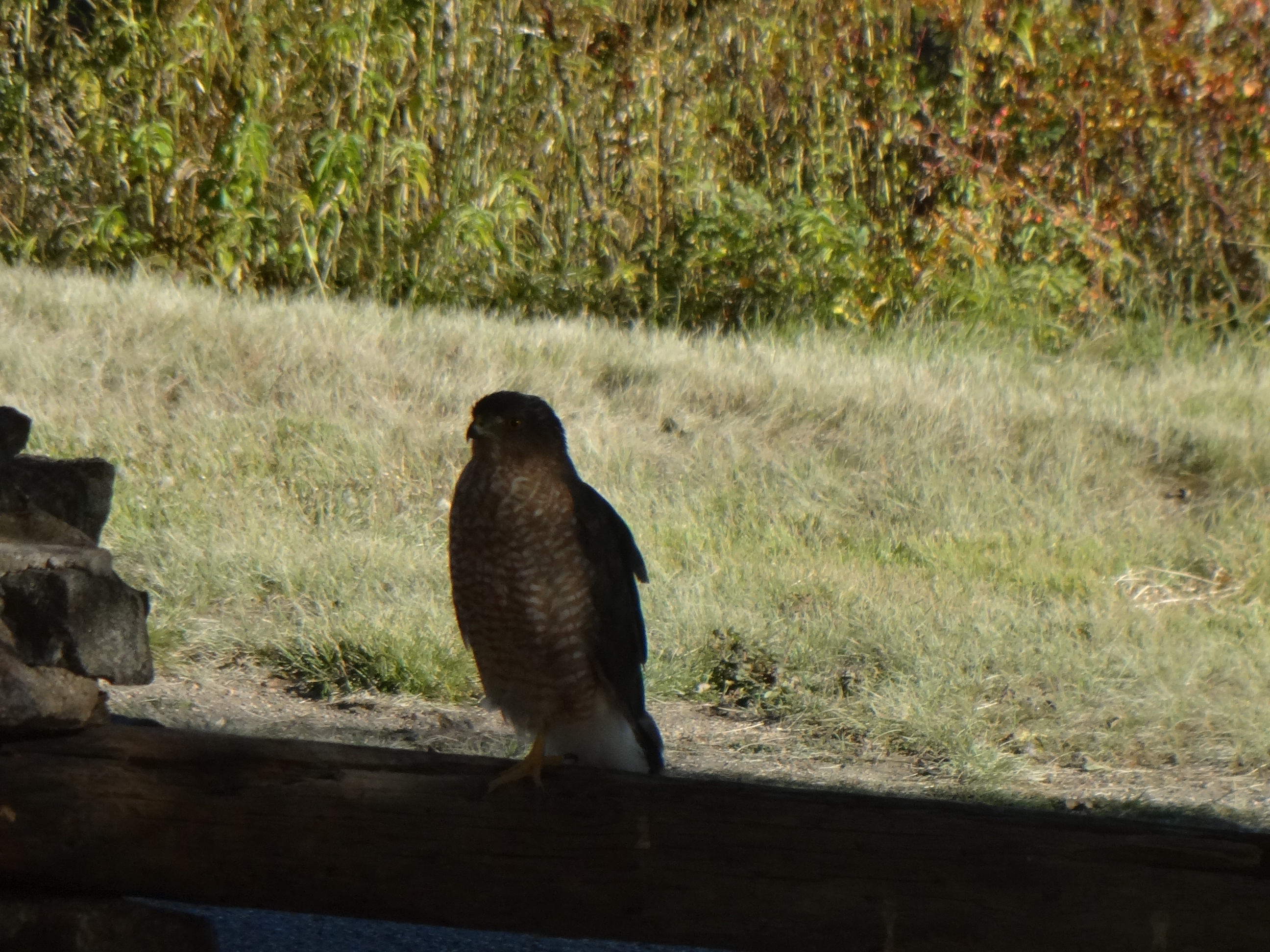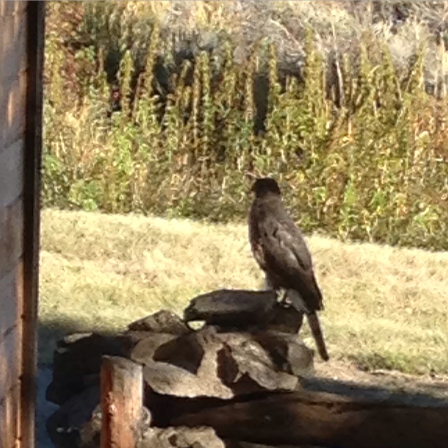 This avian being is, I am fairly certain, related in some form or fashion to the youngster who hit the window a few weeks ago, in a Kamikaze manner reminiscent of a Japanese suicide pilot. He died instantly, I am sorry to say. I wrote about a second one who was ridiculously attempting to nab one of the Stellar Jays out front who were roughly the same size. I theorized that one must have been a male. The one above is about twice the size of the falcon hitting above his weight class (even though the photo may not do it justice). I am theorizing she is a she. As she was NOT attempting to battle the jays, though she did appear to be twice their size.