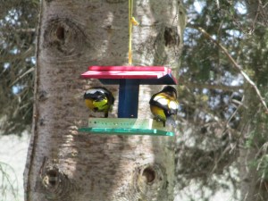 The evening grosbeaks are really quite amazing with their black and bright yellow and white colorings. They like the little bird feeder designed by Grace. Maybe the colors of it? Maybe the black sunflower seeds inside? Since I lack a degree in bird psychology, I’ll never know.
